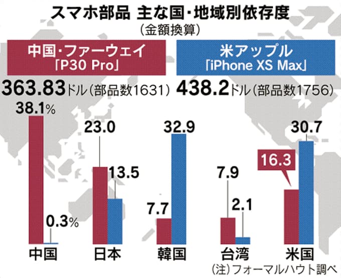 中国通信機器最大手、華為技術(ファーウェイ)の最新スマートフォンの構成部品の5割程度が、金額ベースで日米韓の企業に依存していることが分かった。3カ国への依存度は、アップルでは8割近くに達する。スマホの組み立ては両社とも中国に集中している。米国はファーウェイへの米製品の輸出を禁じており、サプライチェーン(供給網)にはすでに影響が出ている。今後、対中関税「第4弾」が発動され、米国の需要が減少すれば日米韓の企業への打撃が一層広がる。