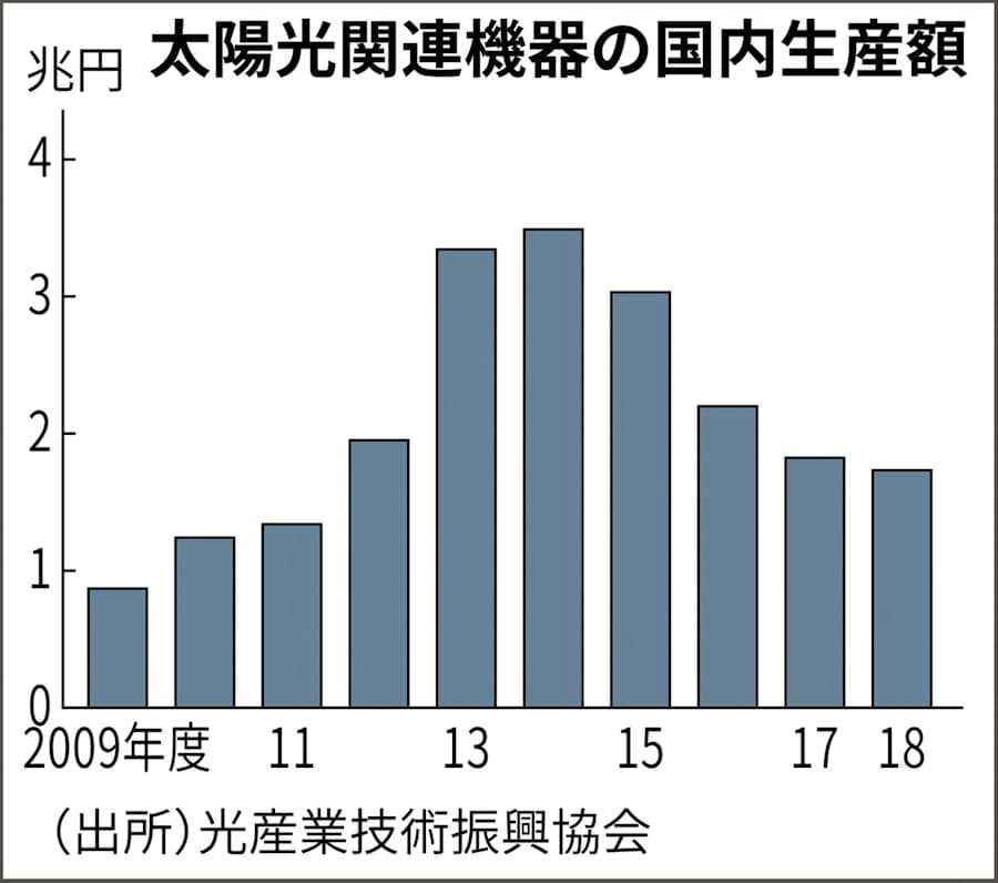 生産額が減少しているのは風力だけでない。光産業技術振興協会によると、太陽光パネルやパワーコンディショナー(電力変換装置)などの国内生産額は18年度に1兆7322億円となり、ピークだった14年度から半減した。特に太陽光パネル関連の生産額は13年度からの5年で約4分の1に減った。